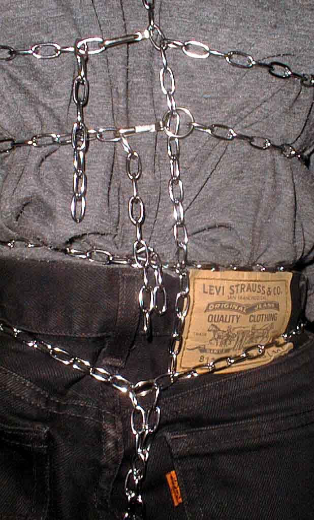 Pak můžete připojit příčné řetízky. Já jsem použil čtyři, jeden nad prsa, druhý pod ně, třetí přes bříško a čtvrtý kolem pasu, nicméně jejich počet se bude asi měnit v závislosti na výšce postavy. Postup připevňování je u všech stejný: provlékněte řetízek očkem vepředu v požadované výšce (pokud konstrukce řetězu neumožňuje provlečení, pomozte si kroužkem na klíče). Pak jeden konec řetězu pevně připevněte k tomu, který vede podél páteře. Můžete buď rozštípnout poslední článek a kombinačkami ho zmáčknout a nebo použít osvědčený kroužek na klíče. K střednímu řetězu připevněte karabinku, zachyťte za ni druhý konec vodorovného řetízku a zbytek (opět s jistou rezervou) uštípněte.